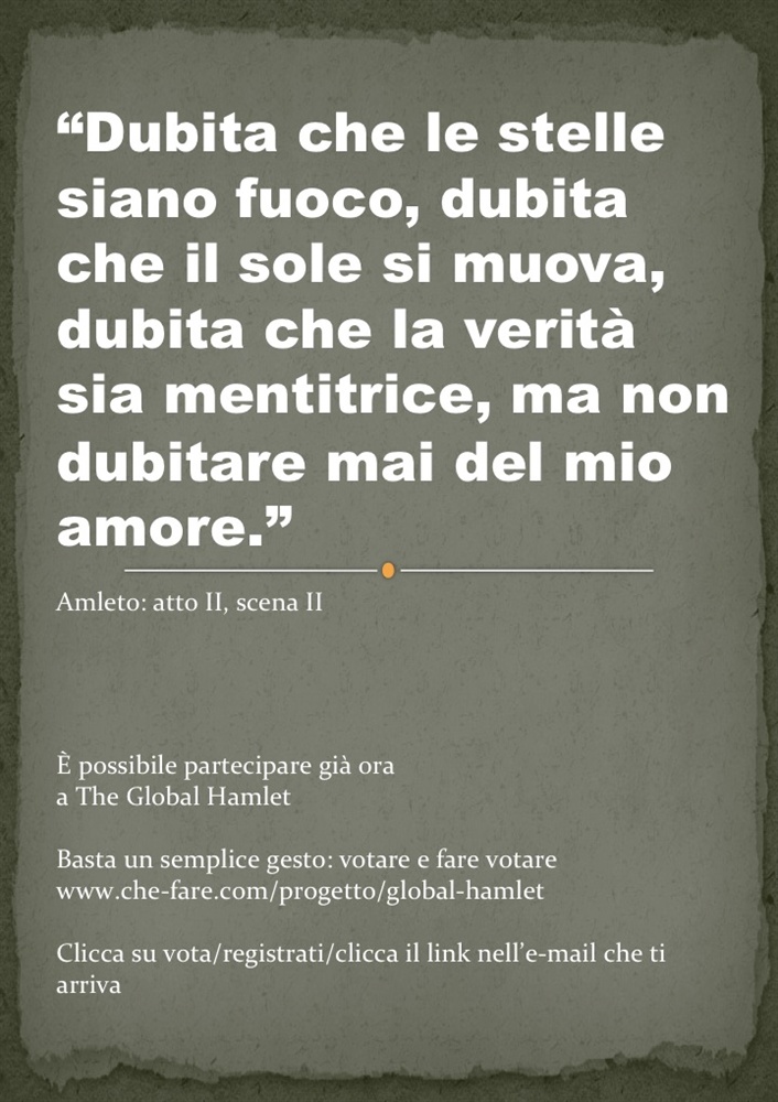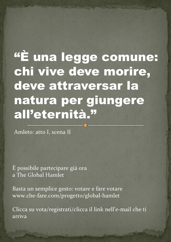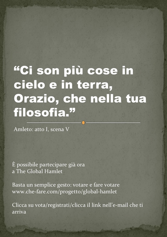 Attualmente The Global Hamlet è stato scelto, tra oltre 500 progetti culturali, per entrare nel gruppo dei 32 progetti finalisti di Che-Fare, concorso organizzato da Doppiozero con l’obiettivo di sostenere le imprese sociali profit e non profit nella realizzazione dei propri progetti, stimolando nel contempo a fare rete e ad attivare network territoriali. È possibile visualizzarne il profilo al link: www.che-fare.com/progetto/global-hamlet