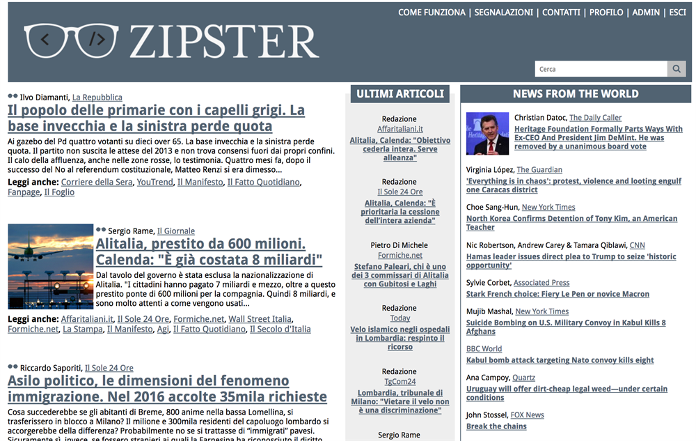 Una panoramica, aggiornata in tempo reale, sulle principali news dall’Italia e dal mondo. Grazie al suo algoritmo “umano” che separa le notizie reali dalle “fake news”, Zipster.it è il primo aggregatore italiano di notizie online che unisce la velocità della tecnologia digitale all’affidabilità di una team “in carne ed ossa” composto da professionisti con un’esperienza decennale nel settore dell’informazione e del digitale.