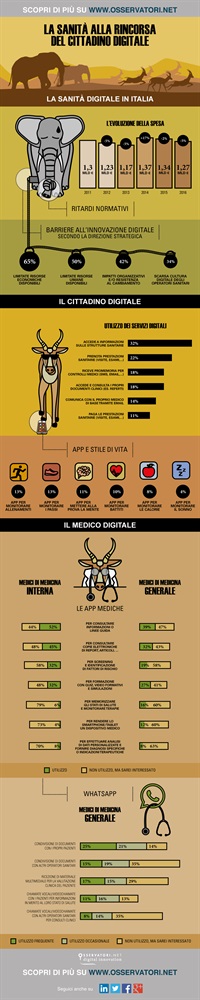 Sono alcuni dei risultati della Ricerca dell'Osservatorio Innovazione Digitale in Sanità della School of Management del Politecnico di Milano* (www.osservatori.net), presentata questa mattina a Milano al convegno “La Sanità alla rincorsa del cittadino digitale”. “La Sanità digitale rappresenta finalmente una priorità per il Governo, per il Ministero della Salute e per le Regioni, tuttavia i tempi di realizzazione delle iniziative a livello nazionale e regionale sono troppo lunghi, con il rischio di non stare al passo con la rapidità di evoluzione di bisogni e aspettative di cittadini e pazienti - afferma Mariano Corso, Responsabile Scientifico dell'Osservatorio Innovazione Digitale in Sanità -. Sono pochi i progressi nella realizzazione del Patto per la Sanità Digitale, che soffre dell'assenza di risorse dedicate. Ma i cittadini italiani utilizzano già ampiamente le tecnologie digitali in ambito sanitario soprattutto per controllare il proprio stato di salute, come dimostra l'uso crescente delle App per il monitoraggio dello stile di vita. E i medici sono già ampiamenti 'digitali': comunicano e condividono documenti e immagini con il paziente attraverso canali 'non convenzionali', come email, SMS e WhatsApp, utilizzano App per aggiornare le proprie competenze”.