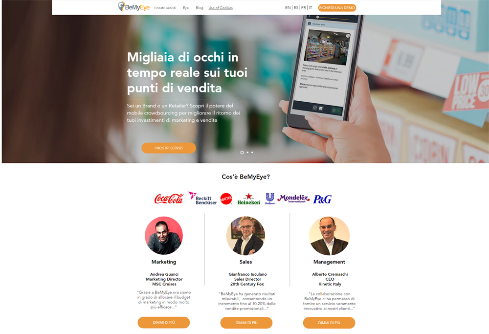 BeMyEye beneficia della potenza di una folla di privati cittadini per fornire, quasi in tempo reale e con inedita accuratezza, dati di business dal territorio a brand e retailer di tutte le tipologie e dimensione garantendo al contempo ai propri Eye la possibilità di guadagnare in maniera compatibile con il proprio stile di vita. BeMyEye connette gli Eye con le aziende in cerca di dati dal territorio come, ad esempio, la corretta esecuzione di promozioni, il lancio di prodotti, le attività di merchandising o controllando l’effettiva distribuzione di un prodotto o, ancora, riducendo il tempo dedicato alle viste sul territorio da parte della normale forza lavoro dell’azienda. Questa modalità consente di ottenere “insight” dal mondo reale affidabili, su larga scala e da ogni luogo. Il metodo consente alle aziende di “vedere” migliaia di luoghi in breve tempo fornendo loro le informazioni per identificare nuove fonti di ricavo, tutelare l’integrità del marchio, misurare la corretta esecuzione delle attività sui punti di vendita e ottenere rapidi risparmi.