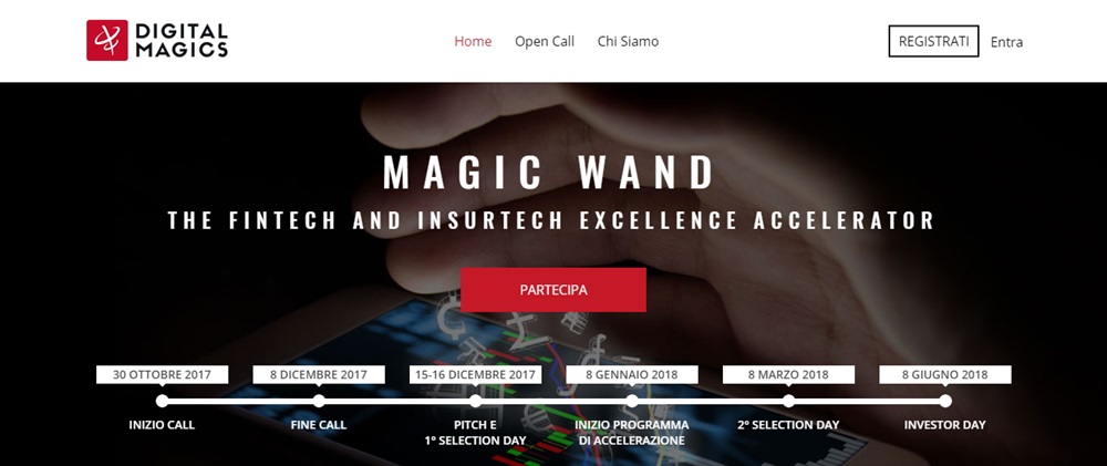 Milano, 30 ottobre 2017 - Digital Magics, business incubator quotato su AIM Italia di Borsa Italiana (simbolo: DM), lancia “Magic Wand”: il primo programma di accelerazione in Italia dedicato ai settori FinTech e InsurTech rivolto alle startup early stage, che stanno sviluppando business innovativi e originali per il mercato finanziario e assicurativo, con servizi e prodotti su banking e pagamenti, investimenti, prestiti e crowdfunding, piattaforme, infrastrutture e strumenti tecnologici.