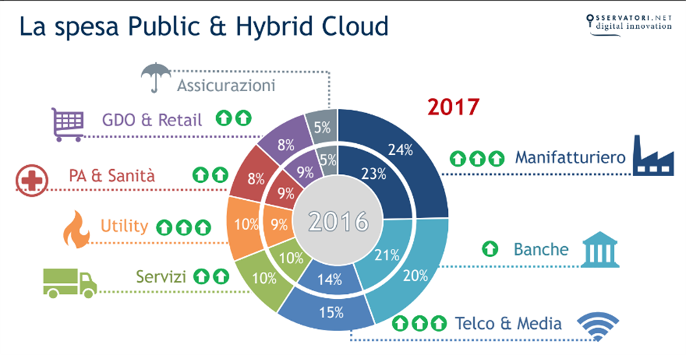 Il 2017 fa registrare una evoluzione del mercato Cloud che complessivamente si avvicina ai 2 miliardi di € (+18%), in particolare nei contesti di Cloud Enabling Infrastructure e Public Cloud con una crescita dei settori di Automation e Convergenza (+10%),Virtual private Cloud (+16%) e Public e Hybrid Cloud (+24%).