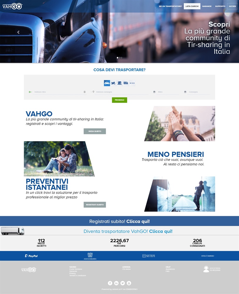 L’innovativa piattaforma ha un’interfaccia semplice e funzionale con la scelta della categoria merceologica subito in homepage (auto, moto, pallet, peso volume, carico completo) e l’elaborazione in tempo reale del prezzo finale del servizio. Se il cliente accetta si passa alla registrazione al portale e al pagamento. A questo punto VahGO ha 48 ore per assegnare il trasporto ai propri partner.