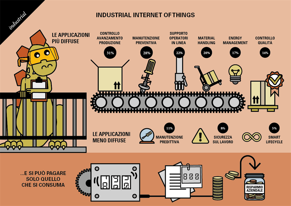 I progetti di Industrial IoT più diffusi in Italia sono legati al controllo dell’avanzamento della produzione (31% dei casi), alla manutenzione preventiva (28%), a un maggior supporto agli operatori nello svolgimento delle attività sulla linea (22%) e al material handling (20%). Seguono le soluzioni per garantire l’efficienza energetica nella fabbrica (17%) e un miglior controllo qualità nelle fasi produttive e di assemblaggio (14%). Manutenzione predittiva (11%), sicurezza sul lavoro (8%) e gestione del ciclo di vita dei prodotti (5%) si collocano tra le applicazioni meno diffuse, ma allo stesso tempo sono quelle che potrebbero avere impatti più rilevanti sui processi aziendali.