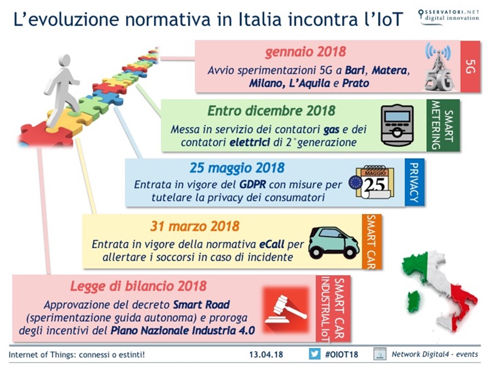 Le previsioni - Nel prossimo futuro si prevede un’ulteriore accelerazione del mercato, soprattutto per quanto riguardo gli ambiti Smart Metering, Smart Car, Smart Home e Industrial IoT. Infatti, la normativa continuerà ad alimentare la crescita delle soluzioni Smart Metering anche nel 2018, con almeno 4 milioni di smart meter gas e 5,5 milioni di contatori elettrici di seconda generazione che verranno installati nelle case degli italiani nel corso dell’anno. La Smart Car proseguirà il suo percorso di crescita grazie all’entrata in vigore, lo scorso 31 marzo, dell’obbligo normativo legato all’eCall (che prevede che tutti i nuovi modelli di auto e furgoni leggeri siano in grado di allertare automaticamente i servizi di soccorso in caso di incidente) e all’offerta sempre più ampia di servizi abilitati dalla connettività. Nell’ambito Smart Home segnali molto positivi arrivano dall’ingresso dei grandi OTT (Over-The-Top) nel mercato italiano (ad esempio Google Home da marzo 2018), con la possibilità di generare un indotto significativo in grado di fare da traino a tutto il comparto. L’Industrial IoT, infine, potrà beneficiare della proroga degli incentivi legati al super ammortamento e all’iper ammortamento previsti dal Piano Nazionale Industria 4.0 anche nel 2018.