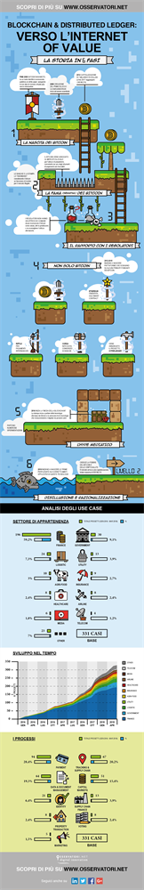 Nel 2017 boom di progetti (+73%) e annunci (+273%) basati sulla blockchain. Principalmente usata per processi di pagamento, ma anche tracciamento e supply chain, gestione documenti e mercati finanziari.