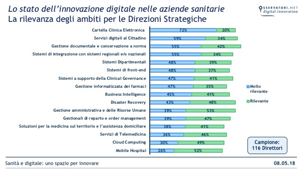 Cartella Clinica Elettronica e servizi digitali ai cittadini gli ambiti più rilevanti per le strutture sanitarie. Cresce la spesa per la Telemedicina, ma non la diffusione. Big Data strategici anche per GDPR.