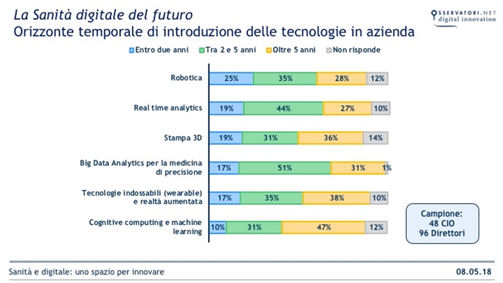 Business Intelligence e Big Data Analytics – Business Intelligence e Big Data Analytics sono considerate aree strategiche sia per il presente sia per il futuro. Lo dimostra il fatto che, nonostante una leggera flessione degli investimenti (13 milioni, contro i 15 del 2016) il 45% dei Direttori li indica come ambiti prioritari, mentre il 70% delle Direzioni e il 55% dei CIO ritengono che l’applicazione dei Big Data Analytics per la medicina di precisione sarà l’ambito che avrà il maggior impatto nei prossimi cinque anni. Tuttavia, è altrettanto diffusa fra i CIO l’idea che siano gli ambiti con la più elevata complessità di realizzazione, soprattutto a causa delle limitate risorse economiche a disposizione, della difficoltà nell’implementare questi progetti e della mancanza di competenze interne. Il grande interesse e dinamismo attorno ai Big Data Analytics è collegato anche all’obbligo di adeguare i processi di raccolta, analisi e utilizzo dei dati sui pazienti al nuovo Regolamento europeo sulla Protezione dei Dati Personali (GDPR), applicato a partire dal 25 maggio. Il tema dovrà essere gestito dal Data Protection Officer (DPO), un nuovo ruolo organizzativo che nel 55% delle strutture sanitarie del campione sarà ricoperto da personale esterno all’azienda. Per prepararsi alla normativa, l’82% delle aziende ha condotto un data audit - un’analisi dei dati gestiti dall’azienda e dei processi che li utilizzano per evidenziare cosa manca per adeguarsi al GDPR – e il 76% ha revisionato e aggiornato le proprie policy e processi. Una minoranza (35%), invece, ha valutato la necessità di apportare modifiche ai rapporti commerciali correnti (ad esempio con i fornitori di soluzioni digitali). Nella quasi totalità dei casi sono state coinvolte la Direzione ICT (94%) e la funzione legale (76%), mentre circa metà delle strutture ha ritenuto opportuno ricorrere a fornitori di soluzioni digitali o società di consulenza. Il 68% delle aziende, infine, prevede sessioni per tutto il personale di sensibilizzazione e consapevolezza sulla protezione dei dati.