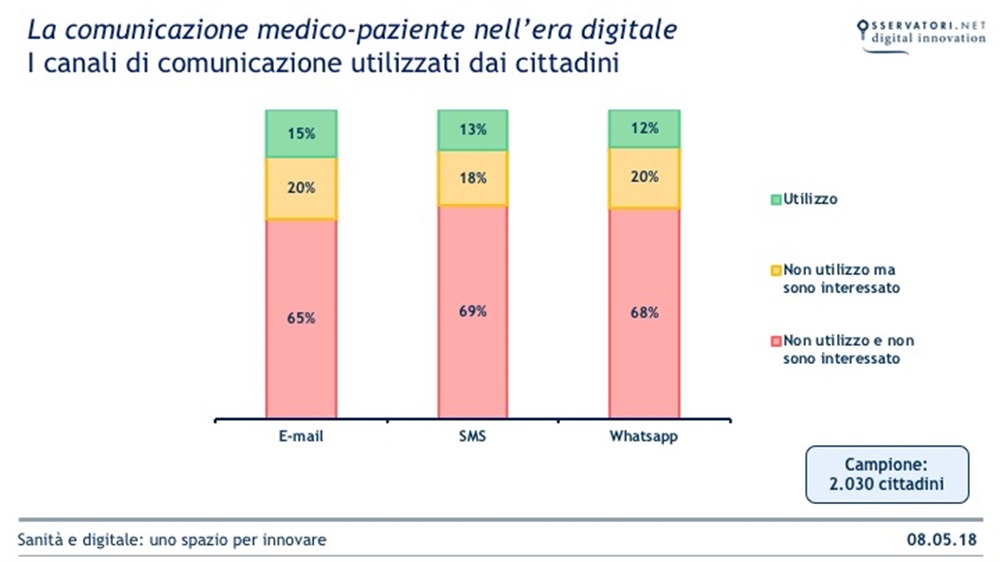 Più digitali i medici: il 77% tra gli specialisti e l’83% dei medici di famiglia usano l’email, il 52% e 63% WhatsApp per scambiare dati, immagini e informazioni.