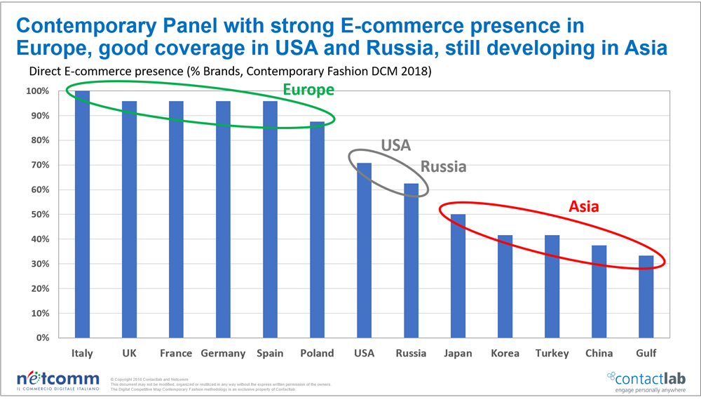 Rispetto ai marchi del Lusso, il panel Contemporary Fashion è meno presente sugli E-tailer specializzati nel Fashion & Luxury come Net-a-Porter, LUISAVIAROMA e Mytheresa. È invece più presente su Amazon Moda, probabilmente una scorciatoia per raggiungere i consumatori, nonostante l’esperienza di navigazione e il posizionamento dei marchi possano risultare molto confusi. Infatti, similarmente a quanto si riscontra sui grandi E-tailer cinesi come JD.com, risulta assai arduo dare una identità ai negozi “ufficiali” dei brand, differenziandoli dai distributori non ufficiali e senza incappare nel rischio di falsi.