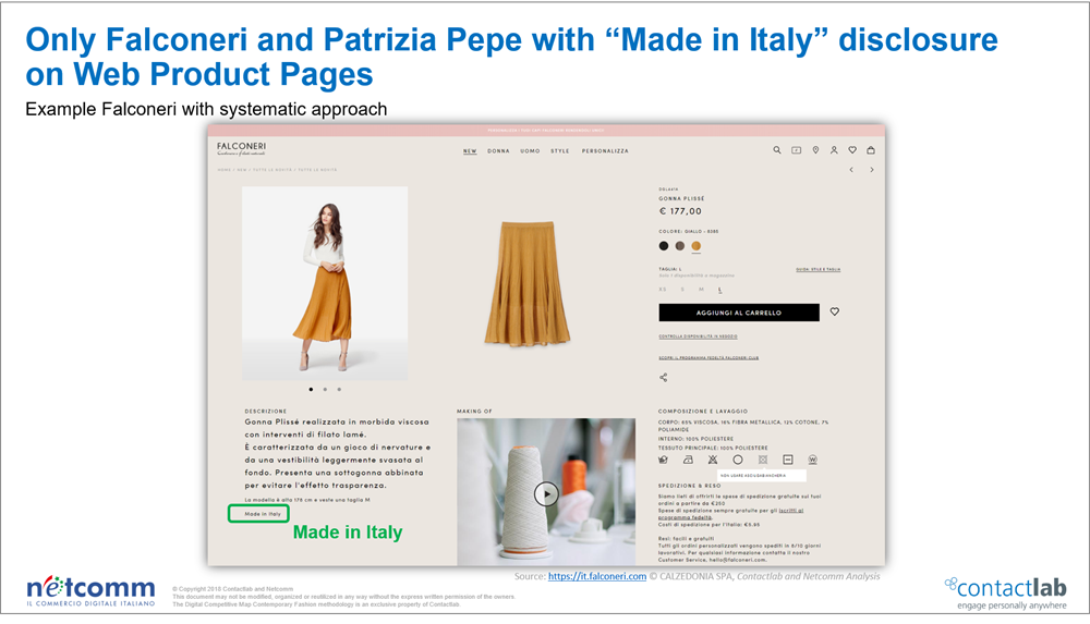 Un vero peccato infine che online la trasparenza sul Paese di produzione dei prodotti sia molto limitata. Questo rappresenta un mancato vantaggio competitivo soprattutto per i marchi che desiderano espandersi nei Paesi asiatici, dove la trasparenza è apprezzata e richiesta da una clientela amante della qualità italiana e francese. Falconeri e Patrizia Pepe rappresentano eccezioni positive.