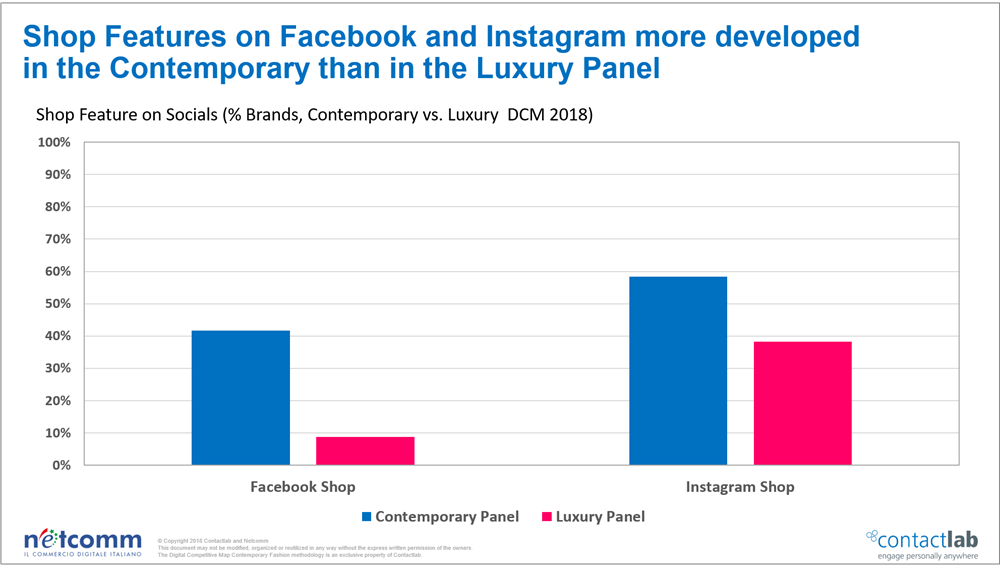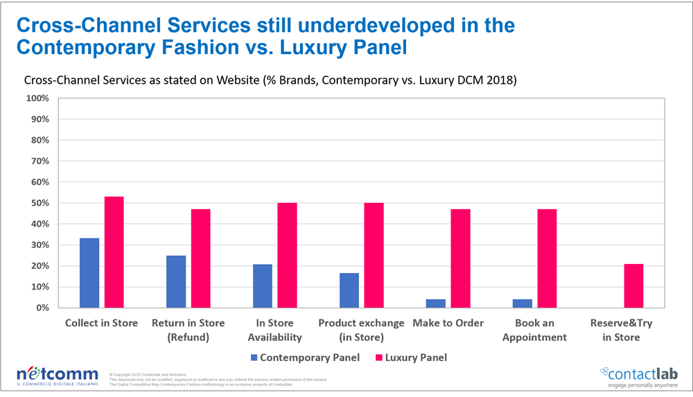 Il Panel Contemporary Fashion risulta molto attivo sui social, non solo a livelli di posting, ma anche di vendita diretta tramite Facebook e Instagram, rispetto ai brand del mondo del Lusso” dichiara Marco Pozzi, Senior Advisor di Contactlab. Note dolenti invece sulla cross-canalità da online a negozi fisici, con pochi brand pronti a offrire servizi come l’acquisto online con ritiro in negozio o la possibilità di rendere o cambiare in store quello effettuato sul web, mixando l’aspetto digitale e quello reale” prosegue Marco Pozzi. Solo Falconeri, Patrizia Pepe e Pinko permettono di verificare la disponibilità in negozio da sito web, mentre Elisabetta Franchi consente di prenotare un appuntamento in negozio dal sito.