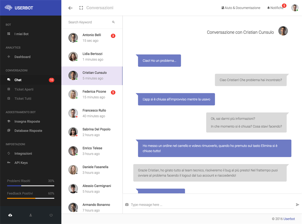Milano, 11 luglio 2018 - Il futuro del servizio clienti online si chiama Userbot, startup italiana attiva da circa 2 anni nello sviluppo di soluzioni CRM basate sulla tecnologia AI proprietaria in fase di brevettazione. Fondata da geek under 35, Userbot supera il tradizionale concetto dell’assistente virtuale per il Customer Support, basandosi sull'integrazione di Intelligenza Artificiale e Umana per la comprensione delle richieste dell’utente e delle emozioni del cliente, con l’obiettivo di interagire automaticamente con quest'ultimo; Userbot infatti NON è un semplice Chatbot (che generalmente sono basati su una tecnologia già obsoleta e con un set di domande e risposte predeterminate), ma è una vera e propria AI per il Customer Service, che cresce la sua base di conoscenza attraverso le interazioni umane che avvengono dentro una qualsiasi chat e su qualunque canale digitale: che sia il proprio sito web, la propria app su Android o iOS, un account social come la propria fanpage Facebook, o un’app di messaggistica come Messenger o Telegram.