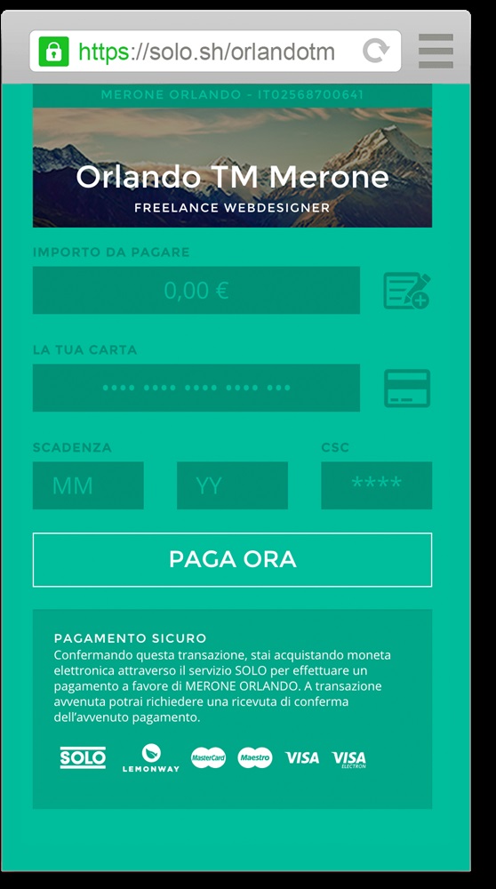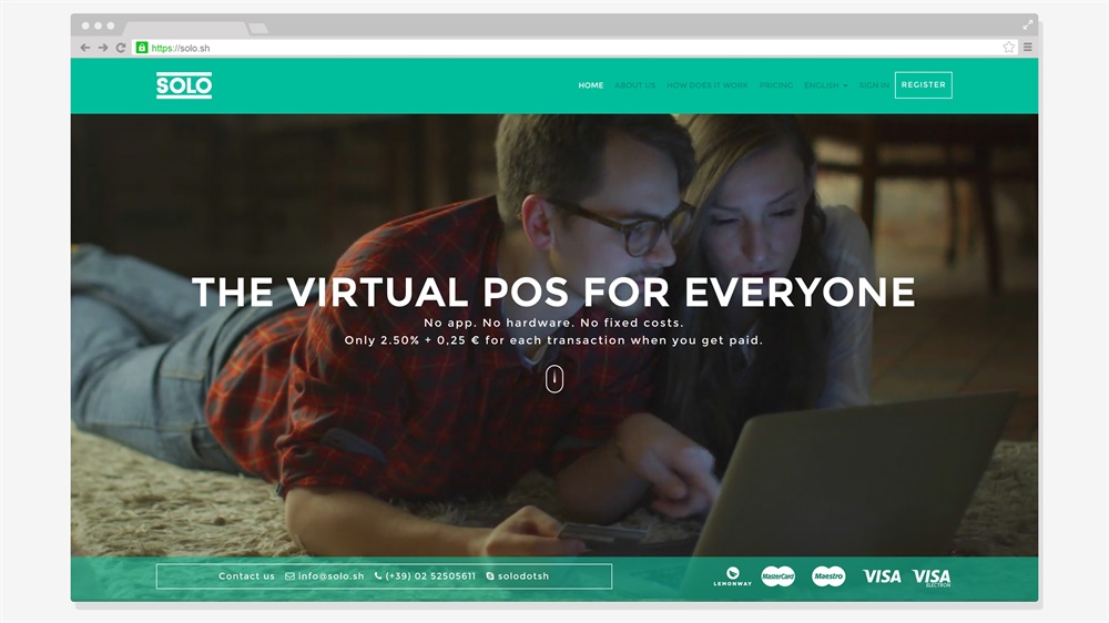 Su www.solo.sh (acronimo di social local shopping) liberi professionisti, PMI e pubblici esercizi (tour operator, call center, alberghi, bed & breakfast, ecc…) potranno creare una pagina pubblica personalizzabile della propria attività, come su tutti i maggiori social network. SOLO permette di inviare ai clienti un link dal profilo del merchant – tramite posta elettronica, SMS, messaggio sui social, QR code o TAG NFC[1] – per pagare lì direttamente o in secondo momento a distanza, in maniera completamente virtuale tramite carta di credito e di debito e senza la necessità di un terminale POS fisico.