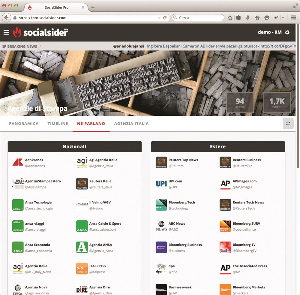 SocialSider è la nuova piattaforma di informazione sviluppata da Atomic Media. SocialSider incrocia news tradizionali e conversazioni su Twitter sui temi dell’attualità e offre un’approfondita panoramica degli avvenimenti. Le fonti sono riunite e organizzati in un solo prodotto facile da consultare, tempestivo e affidabile grazie a un’accurata mappatura dei canali. SocialSider è il prodotto di Atomic Media dedicato alle news, al commento e all’approfondimento.