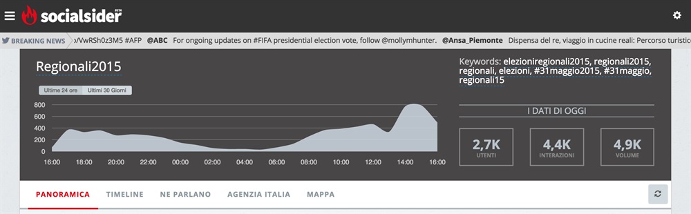 SocialSider classifica le news e i tweet geolocalizzati. Le province più attive sulle Regionali2015 sono Roma, Milano, Genova, Bari e Napoli.