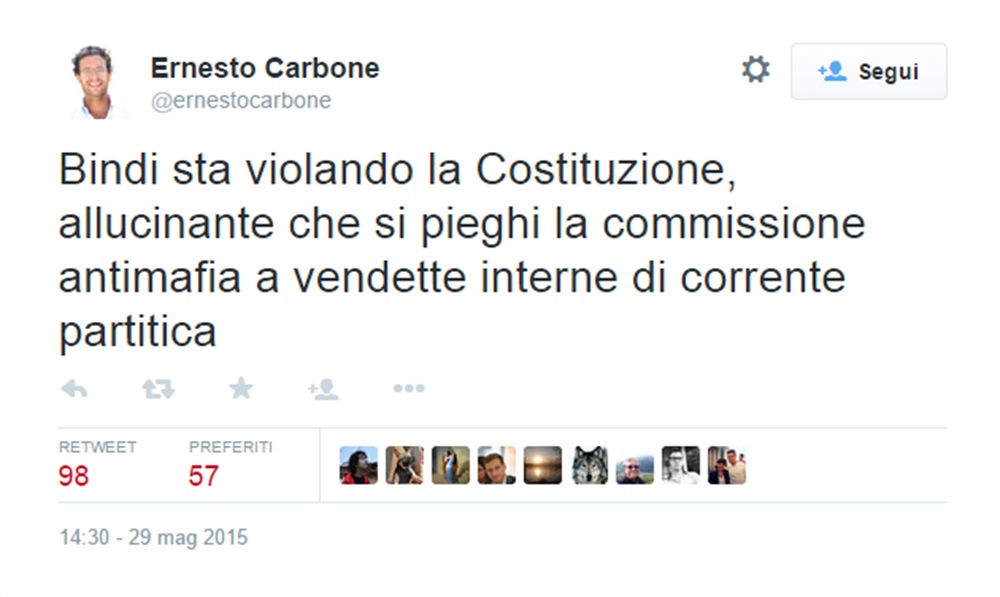 Tra i tweet che hanno scatenato la polemica e alimentato il dibattito all’interno del Pd e all’esterno sui socialfigura, al primo posto, quello del deputato del Partito Democratico Ernesto Carbone che critica pesantemente Rosy Bindi e ottiene 88 retweet e 52 preferiti: