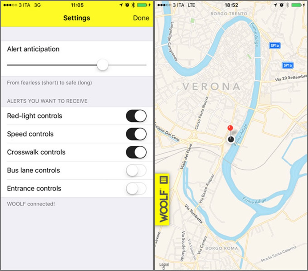 Sicurezza, libertà e velocità. Il motociclista dovrà solo tenere gli occhi fissi sulla strada e godersi il piacere della guida, i punti sensibili li segnalerà WOOLF grazie ad un servizio di mappatura mondiale. Più la moto si avvicinerà al misuratore di velocità, maggiore sarà la frequenza della vibrazione che il biker avvertirà sul suo polso. Questo consentirà di arrivare alla velocità corretta in prossimità delle zone sensibili.