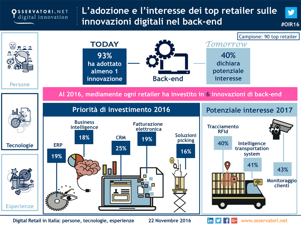 Le innovazioni digitali nel back-end sono le più diffuse e consolidate tra i top retailer italiani: il 93% del campione ne ha adottata infatti almeno una. Gli investimenti nel 2016 sono stati maggiormente focalizzati su soluzioni di CRM (25% del campione), soluzioni a supporto della fatturazione elettronica e dematerializzazione (19%), sistemi ERP (18%), sistemi di business intelligence analytics (18%) e soluzioni per incrementare le performance di magazzino, come il voice picking (16%).