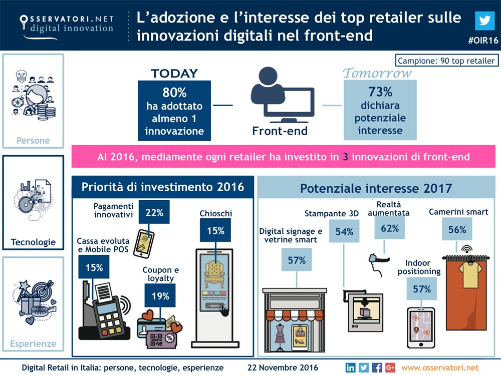 L'80% del campione di top retailer ha sviluppato almeno una innovazione digitale nel front-end a supporto della customer experience in punto vendita. Le soluzioni su cui si sono concentrati maggiormente gli investimenti nel 2016 sono sistemi per l'accettazione di pagamenti innovativi (22%), sistemi per l'accettazione di couponing e loyalty (19%) chioschi, totem e touchpoint (15%), sistemi di cassa evoluti e Mobile POS (15%) e digital signage e vetrine intelligenti (13%).