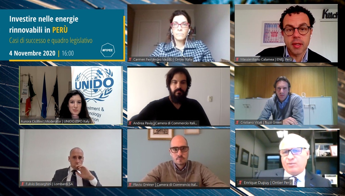 Con l’obiettivo di promuovere opportunità locali di investimento in ambito di fonti energetiche alternative, il 4 novembre 2020 UNIDO ITPO Italy ha tenuto il webinar “Investire nelle energie rinnovabili in Perù: casi di successo e quadro legislativo”, un evento virtuale incentrato su diversi casi di successo italiani in Perù e sul quadro normativo per incentivi agli investimenti nel paese.