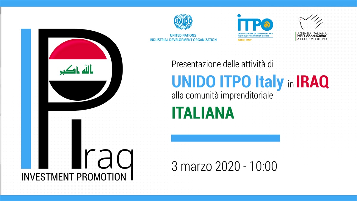 UNIDO ITPO Italy organizes the launch event of the project “Investment Promotion for Iraq – Phase II” taking place on Wednesday 3 March at 10:00 (CET). The event is addressed to the Italian business community and aimed at presenting the activities of UNIDO ITPO Italy in the framework of the project funded by the Italian Agency for Development Cooperation (AICS) and implemented by UNIDO.