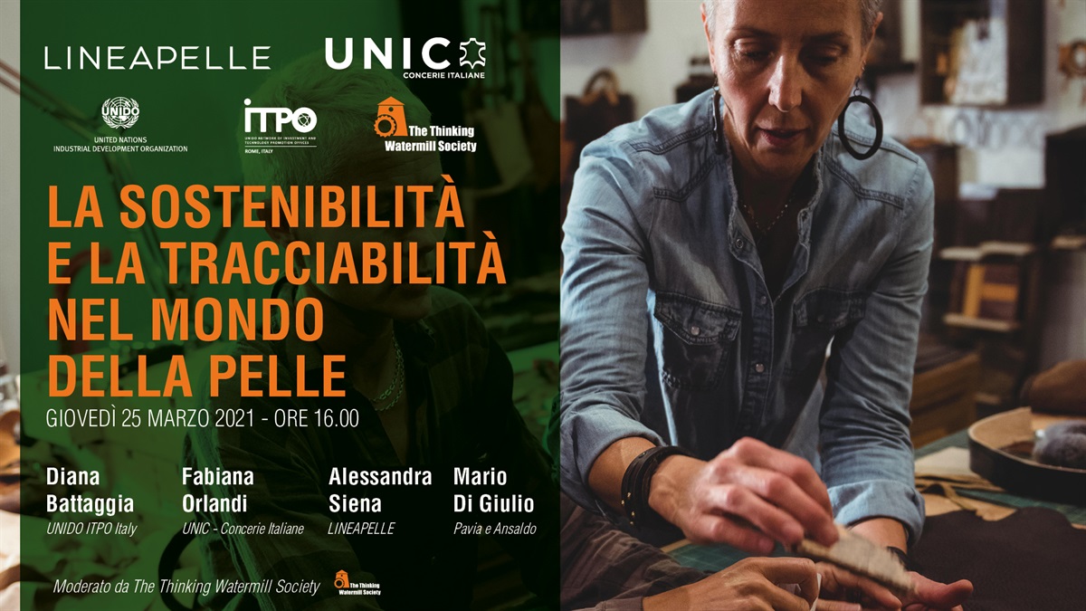 Si è tenuto il 25 marzo 2021 il webinar “La sostenibilità e la tracciabilità nel mondo della pelle”, il secondo episodio in un ciclo di due appuntamenti organizzati da UNIDO ITPO Italy in collaborazione con UNIC - Concerie Italiane, Lineapelle e The Thinking Watermill Society e volti ad approfondire il dialogo sul materiale della pelle e dell’industria conciaria attraverso gli interventi di vari esperti operanti nel settore.