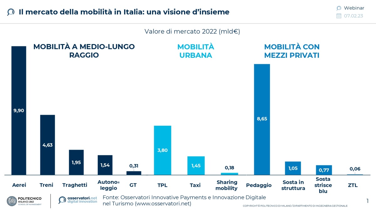 Queste alcune delle evidenze emerse dagli Osservatori Innovative Payments e Innovazione Digitale nel Turismo - School of Management del Politecnico di Milano*, in occasione del webinar “La mobilità in Italia: valori di mercato e strumenti di pagamento nel 2022” .Durante l'evento è stata presentata la seconda ricerca sulla Mobility in Italia, realizzata con Mooney come main partner, che ha avuto come obiettivo quello di comprendere il valore del mercato nelle sue diverse componenti e le abitudini di pagamento nel settore della mobilità nel 2022, sia in termini di strumenti di pagamento scelti, sia in termini di canali di acquisto.