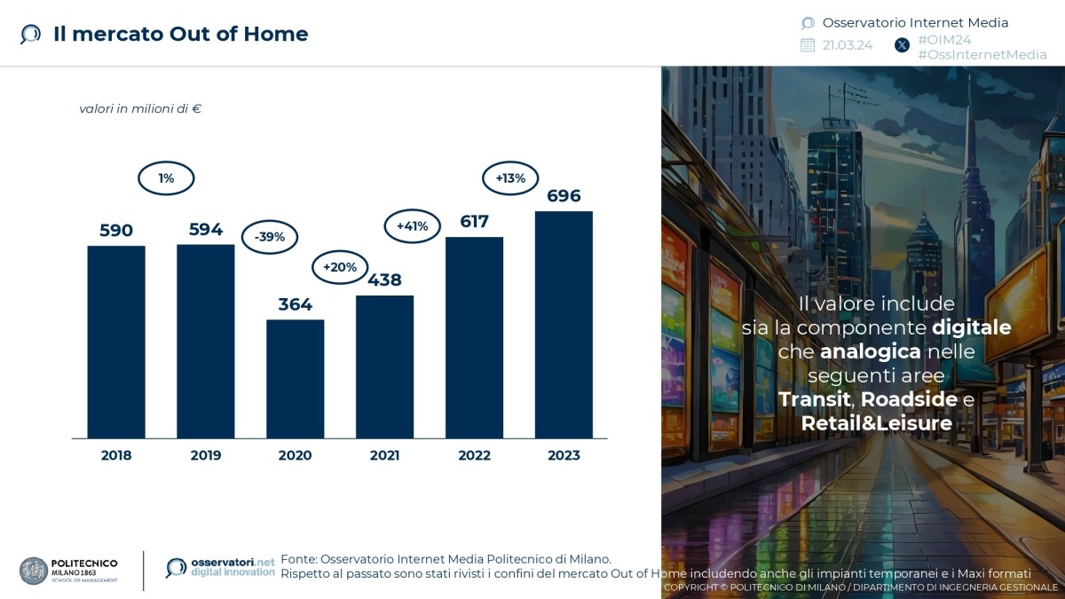 Milano, 21 marzo 2024 - In Italia nel 2023 il mercato pubblicitario Out of Home (OOH) continua a crescere (+13%) e tocca quota 696 milioni di euro, aumentando la sua importanza all’interno del Media Mix pubblicitario e raggiungendo il 7% della raccolta complessiva italiana (+1 punto percentuale rispetto al 2022). In questo panorama è sempre più rilevante il ruolo del Digital Out Of Home (DOOH), che con 201 milioni di euro (+21%), pesa circa un terzo sulla raccolta totale del mezzo.