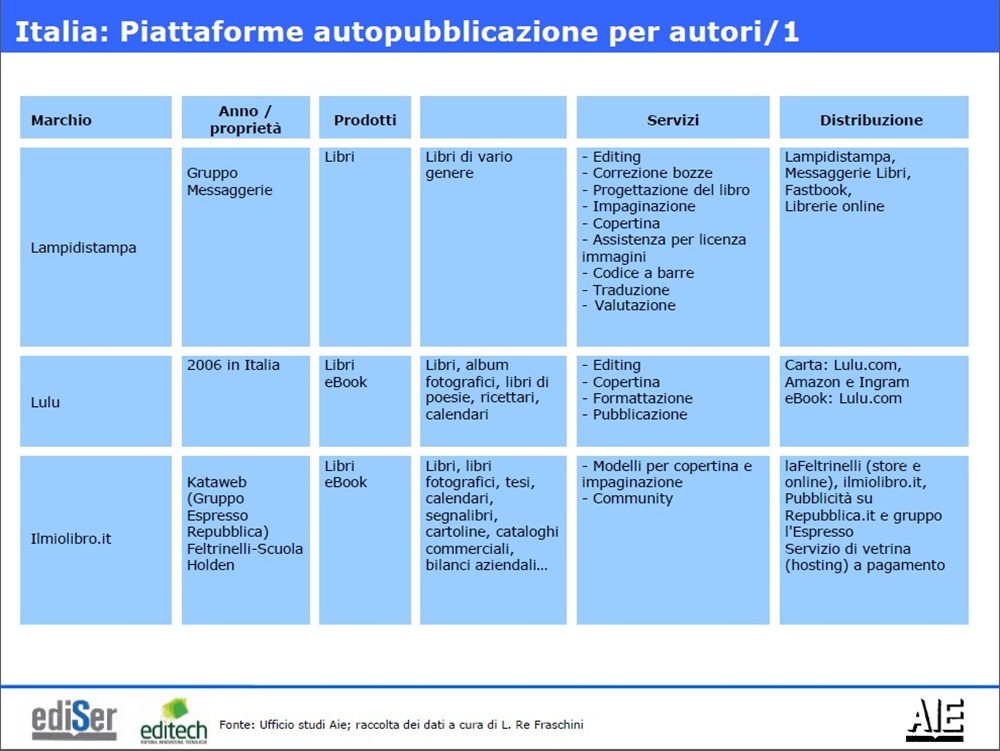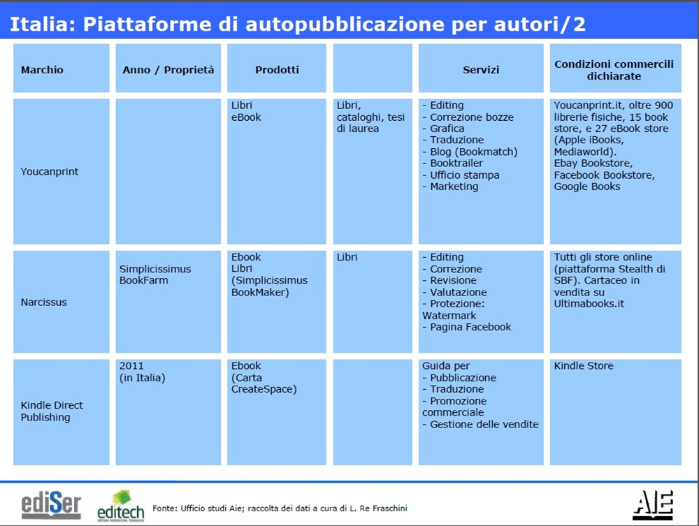 E il fenomeno in Italia? Comincia ad avere una suo piccolo ruolo: almeno 40mila i titoli cartacei, altri 6500 in ebook: le stime di AIE individuano 38-40mila titoli self-printing attualmente “in catalogo”, pari al 5-5,5% dei titoli in commercio. Altri 6mila-6.500 titoli in versione ebook (ma potrebbero essere versioni pdf del libro cartaceo).