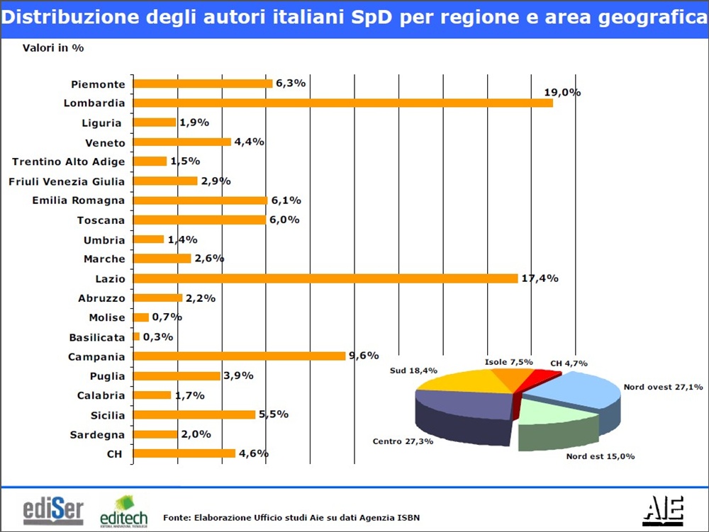 La Lombardia domina anche qui, seguita a stretto giro dal Lazio: il 19% degli autori italiani selfprinting – uno su cinque praticamente - ha sede in Lombardia. Il 17, 4% viene dal Lazio, il 9,6% (a sorpresa) dalla Campania.