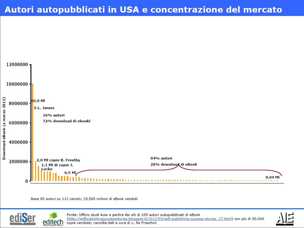 Il fenomeno negli Stati Uniti: in crescita (+58% nel 2011 sull’anno precedente): nel 2010 i titoli autopubblicati erano 133.036, nel 2011 sono stati 211.269 (+58%). Il genere più popolare è quello della fiction (45%), ma in cima alle vendite c’è la non-fiction (38%).