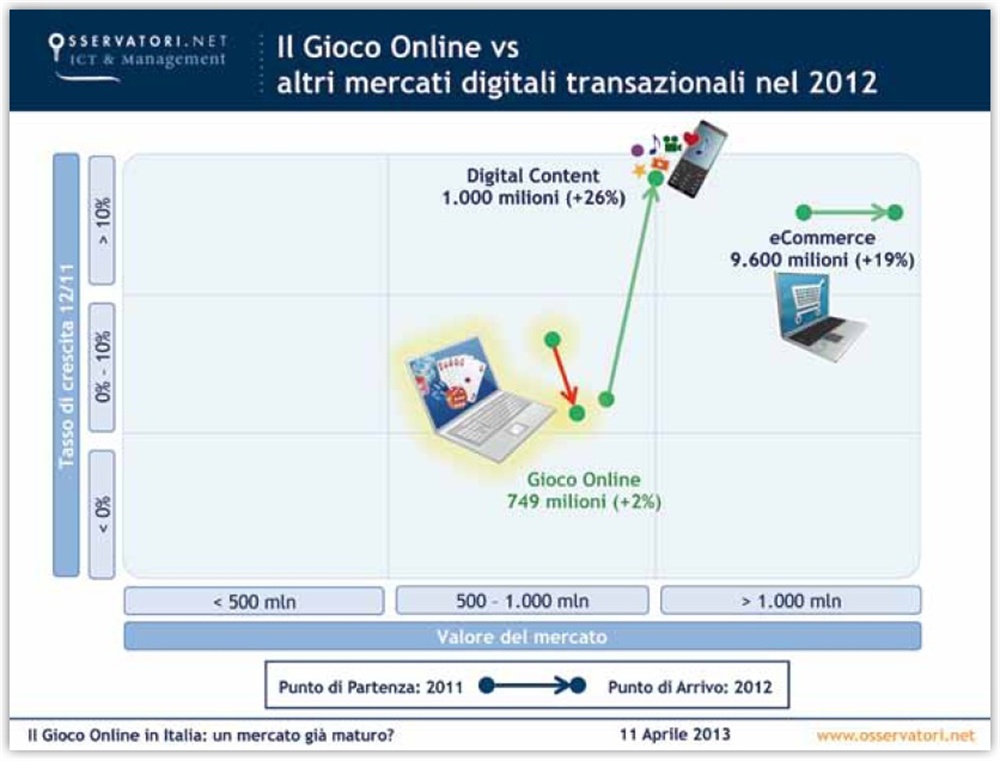 Nel confronto con gli altri mercati transazionali online, il Gioco Online perde terreno sia nei confronti dei Digital Content (acquisto online di news a pagamento, musica, video, applicazioni mobile, ecc.), che nel 2012 crescono dioltre il 25% e valgono circa 1 miliardo di euro, sia nei confronti dell’eCommerce B2c, che nel 2012 è aumentato del 19% raggiungendo un valore di oltre 9,6 miliardi di euro. Trai mercati transazionali, il Gioco è l’unico ad avere ridotto la sua crescita dal 2011 al 2012, passando dal +7 al +2%. L’eCommerce B2c è invece cresciuto con un tasso in linea rispetto a quello registrato nel 2011, mentre i Digital Content hanno accelerato la propria crescita, che nel 2011 era stata pari al 2%.