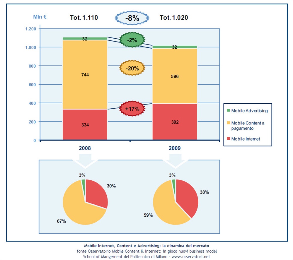 A fronte di questo buon andamento del Mobile Internet, crolla, invece, del 20% la vendita dei contenuti per cellulari per effetto di fenomeni opposti: il declino di alcuni comparti di offerta più tradizionali (come i loghi, le suonerie, i giochi java, i servizi Sms di Infotainment, ecc.), che bruciano nel 2009 oltre 160 milioni di euro; la notevole crescita dei nuovi comparti di offerta abilitati dal paradigma del Mobile Internet e degli Application store, che generano tuttavia ricavi ancora estremamente contenuti in valore assoluto (ben poche decine di milioni di euro).