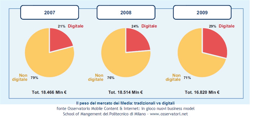 Guardano con particolare attenzione a queste evoluzioni le Media company, che stanno sperimentando nuovi modelli di business abilitati dal Mobile Internet e dagli Application store, anche per cercare di compensare il forte calo di ricavi registrato nel 2009 (-9%), tutto imputabile alla componente tradizionale che ha bruciato in un anno oltre 2 miliardi di Euro, a fronte di una crescita di 500 milioni di Euro della componente digitale.