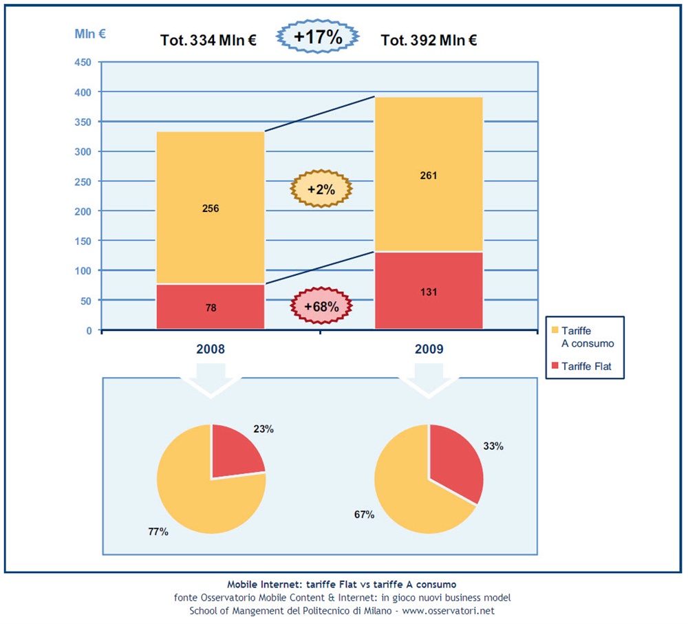 Questi numeri  - ha dichiarato Filippo Renga, Responsabile Ricerca Mobile Content & Internet della School of Management del Politecnico di Milano -  evidenziano chiaramente la strada maestra su cui gli operatori di telefonia mobile stanno puntando: se fino a ieri sembravano voler presidiare direttamente anche l’offerta di contenuti e la gestione della pubblicità sul canale Mobile, oggi preferiscono puntare a generare ricavi dalla Mobile broadband, ed in particolare dalla sua componente più innovativa rappresentata dal Mobile Internet. Si è, infatti, oramai innescato nel mercato del Mobile Internet un circolo virtuoso spinto da diversi fattori: l’introduzione da parte di tutti gli operatori di interessanti piani tariffari Flat (+68% di ricavi da Tariffe Flat nel 2009); i notevoli investimenti in comunicazione verso il mercato; gli accordi tra gli operatori di telefonia e i principali brand del Web (social network, in particolare); la sempre maggiore diffusione di smartphone con una buona capacità di navigazione. Questi fattori spingono un numero crescente di utenti verso il Mobile Internet (abbiamo già superato i 10 milioni di utenti unici al mese), inducendo a loro volta un numero sempre maggiore di Content provider (Web Company, Media Company, ecc.) a sviluppare un’offerta di contenuti ottimizzata per la fruizione in mobilità.”