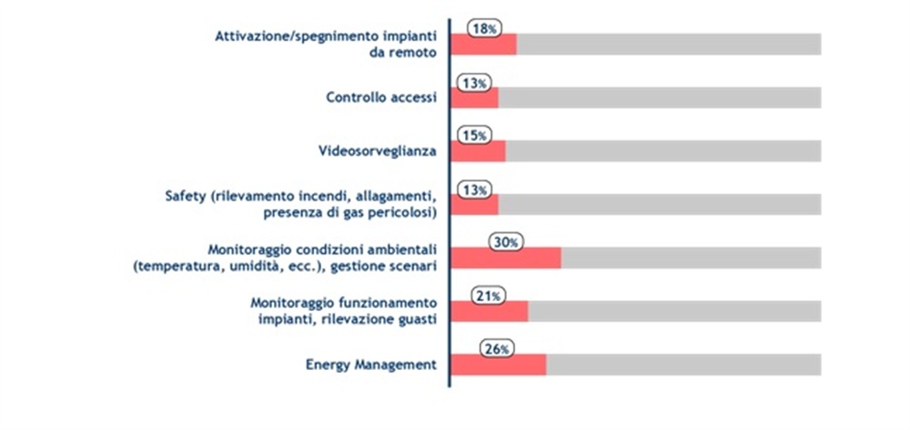 Il 30% vorrebbe infatti adottare sistemi di monitoraggio delle condizioni ambientali (temperatura e umidità), mentre il 26% del campione punta a sistemi di Energy Management. A questi si aggiunge il monitoraggio del funzionamento degli impianti con rilevazione dei guasti, di interesse per il 21% dei soggetti intervistati, orientati a migliorare ulteriormente l’efficienza dei processi di Facility Management.