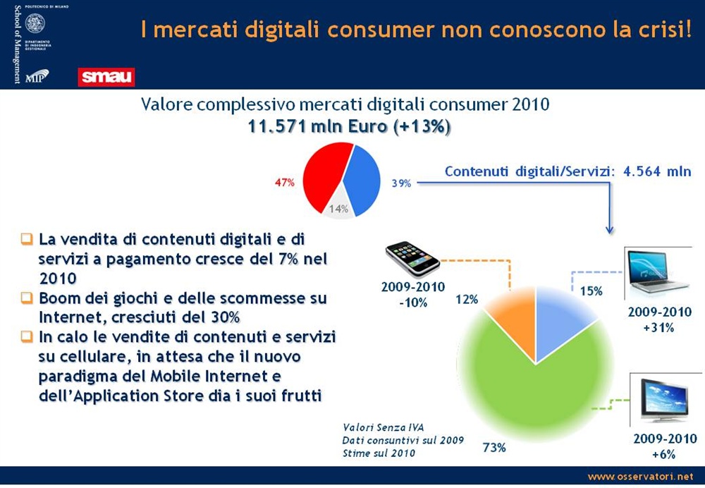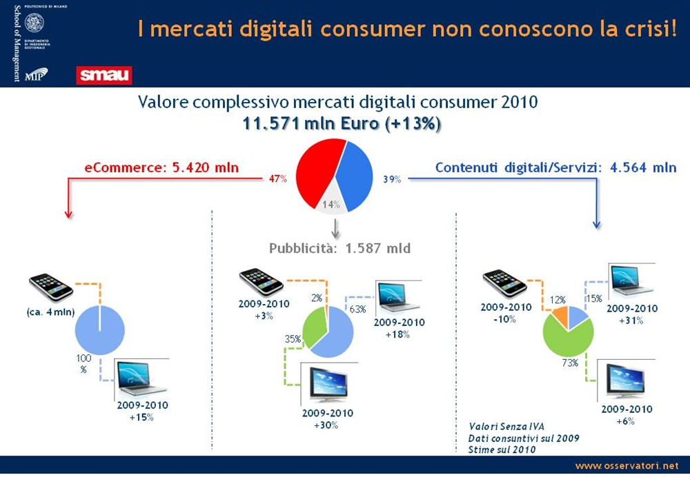 Nel 2010 i mercati digitali consumer crescono del 13% rispetto al 2010 e superano gli 11,5 mld di Euro (vedi immagine allegata Figura 1. Il valore dei mercati digitali consumer, scomposti per comparto e per tipologia di canale; Fonte: Osservatorio Smau-School of Management del Politecnico di Milano).