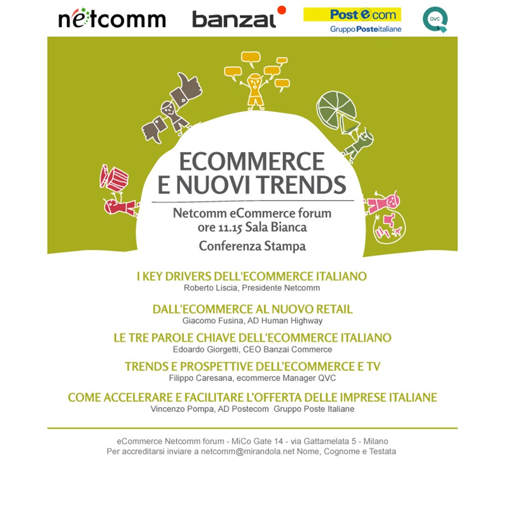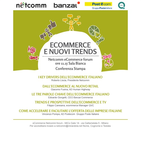 In particolare per la stampa è prevista una conferenza dal titolo "Ecommerce e nuovi trends", alle ore 11.15 in Sala Bianca, durante la quale verranno approfonditi i dati dell'"Osservatorio Net Retail", realizzata da Netcomm con il supporto di Human Highway e con il contributo di Banzai, Postecom e QVC. All'incontro verranno ricapitolati i dati salienti dell'indagine dedicata ai comportamenti dei consumatori (cosa comprano le donne, cosa gli uomini, scontrini medi per diverse merceologie, ecc.). In allegato il programma dell'incontro stampa.