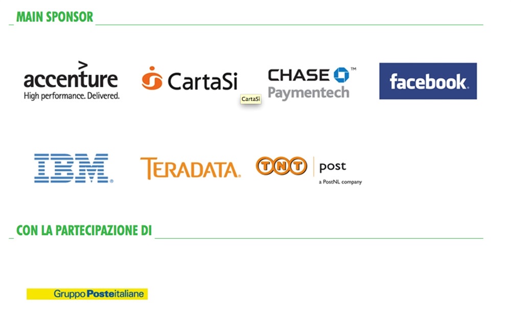24Adv.it, 2beweb2.com, ADTZ, alpenite, Amazon, artera.it, Bazaarvoice, BluLab, Boraso.com, BRT calicantus,ContactLab, Docdata Payments, Doralab, Dylog Italia S.p.A., Effiliation, Egentic, e-motion, FACT-Finder, FIND, GLS Corriere Espresso, Gruppo Sinergia, HiPay, hybris Software, Icecat, InPost, Intershop, Intesa San Paolo,Jumio, LeGuide Group, Lengow, Ligatus, MagNews, MailUp, Meet Magento Italy, MIRAKL, modomodo, neen, Networth, Oracle, PayPal , Prestashop, PRIMEWEB, prudsys, PVS Services Italia, Rajapack, Recensioni Verificate, Reply, Scancube, SEMrush, sisalPay, Skebby, SMC, Consulting Social, Media Marketing Day, SOFORT, Sopra, STORE360, storeden, TAG Commander, TEMBO, TNT Express, triboo, TSW, Ubifrance, Ve Interactive, Vivocha, webdata solutions, webformat, Webtrekk, Zebestof, Zoorate.