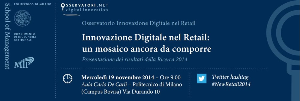 L’edizione 2014 dell’Osservatorio Innovazione Digitale nel Retail è realizzata con il patrocinio di Federdistribuzione e con il supporto di aKite, Easy Nolo Gruppo Banca Sella, GS1 Italy | Indicod-Ecr, Ingenico, NTT DATA, Samsung, TESISQUARE®; BNL, Catalina, Konvergence, SIA, Toshiba.