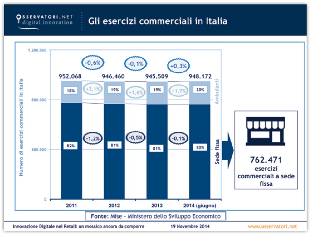 A Giugno 2014 in Italia erano presenti circa 950.000 esercizi commerciali (esclusi ristoranti e bar), di cui l’80% a sede fissa (770.000 negozi, in calo dello 0,1% circa rispetto al 2013). Questi esercizi sono riconducibili a circa 650.000 imprese di vendita al dettaglio, pari al 18% di quelle di tutta Europa (EU 27): una volta e mezza le imprese presenti in Francia, il doppio di quelle in Germania e il triplo di quelle in UK. Il fatturato medio delle imprese italiane vale la metà di quelle francesi, un terzo di quelle tedesche e un quarto di quelle inglesi.
