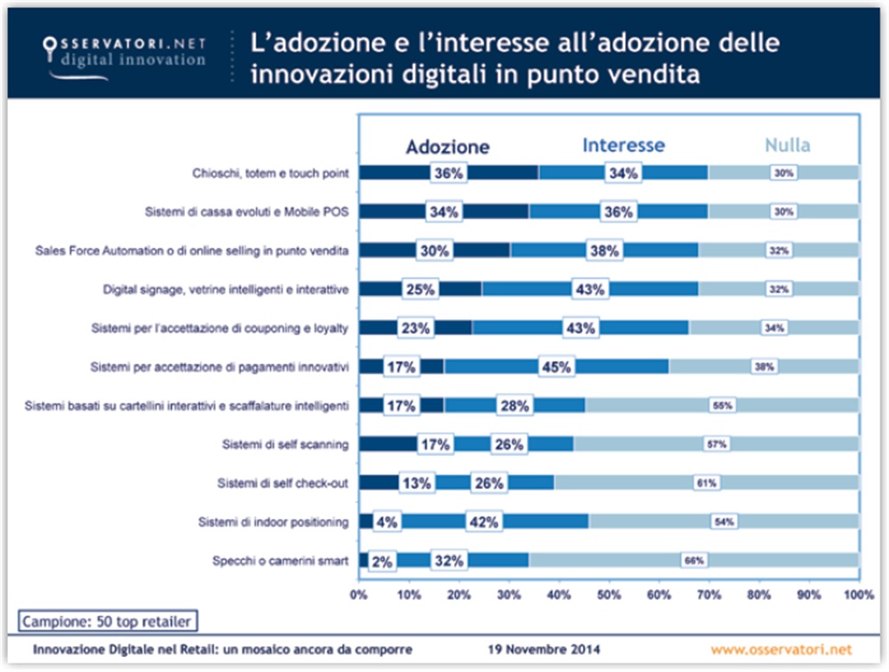 Nel corso del 2014 i retailer italiani hanno investito nell’installazione di chioschi, totem o touch point (il 36% del campione ha già investito e il 34% ha intenzione di farlo nel 2015); in soluzioni di innovazione come digital signage, vetrine intelligenti e interattive (il 25% del campione ha già investito e il 43% ha intenzione di farlo nel 2015); cartellini interattivi e scaffalature intelligenti, utilizzati per fornire al consumatore maggiori informazioni sul prodotto (implementate dal 17% del campione e di interesse per il 28%); sistemi di indoor positioning, (4% del campione, ma suscitano nel 42% dei retailer un forte interesse).