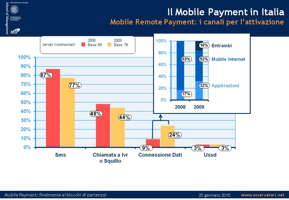 Come risulta dall’analisi dei servizi attualmente offerti in Italia, gli italiani che utilizzano il Mobile Payment sono ancora una porzione estremamente limitata, se si escludono le donazioni tramite Sms premium. Con il medesimo metodo è possibile stimare che nel 2009 il valore delle transazioni legate al Mobile Payment,escludendo i contenuti digitali per Mobile come ad esempio, giochi, informazioni, musica  o suonerie, non ha superato le poche decine di milioni di € ed è stato generato, principalmente, proprio dalle donazioni e dalle ricariche del credito telefonico. A conferma di questo, un’indagine specifica sui consumatori italiani, volta a studiare la loro sensibilità e il loro approccio verso il Mobile Proximity Payment, evidenzia che un numero irrisorio di Italiani (che non consente neanche di dare una indicazione quantitativa statisticamente significativa) ha dichiarato che negli ultimi 12 mesi ha usato il cellulare per “acquistare beni o servizi via sms” (ad es. pagare il parcheggio o l'ecopass), mentre il 18% ha indicato di averlo utilizzato “per beneficenza inviando un sms” (ad esempio, per i terremotati d'Abruzzo, Lega del Filo d'Oro, Telethon, ecc.). Sono però oltre il 40% gli Italiani che si dichiarano molto attirati dalla proposta di un servizio di pagamento con telefonino che sia rapido, sicuro, facile da usare e questo lascia ben sperare nella veloce diffusione dei servizi di Mobile Proximity Payment non appena il sistema di offerta li renderà disponibili”.