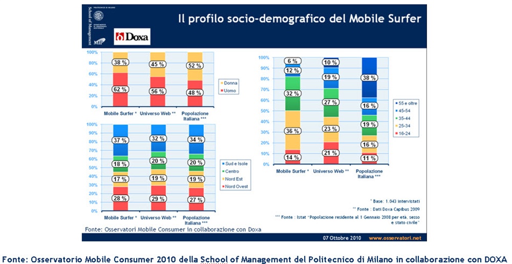 I Mobile Surfer sono prevalentemente uomini (62%), giovani entro i 44 anni (80%), con un elevato grado di istruzione e in possesso di terminali di fascia alta. Questa popolazione sta crescendo giorno per giorno, tanto che gli heavy users - cioè quelli che accedono a Internet via mobile quasi tutti i giorni - sono già oltre il 50% dei mobile surfer.