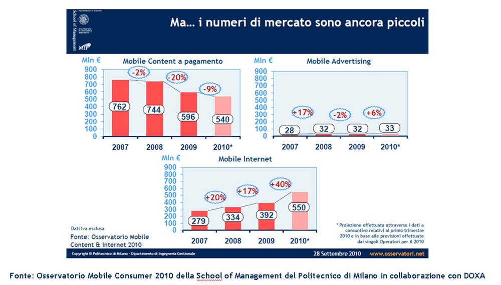 Il telefono cellulare sta diventando sempre di più una importante via di accesso al mondo Internet. Nel 2013, a livello mondiale, i telefonini potrebbero superare i pc come principale mezzo di navigazione. Ma le aziende lo hanno capito per ora solo in parte. Analizzando, infatti, l’andamento del mercato Mobile, notiamo che a fronte di una diminuzione del 9% della vendita di contenuti a pagamento che arriva a quota 540 milioni di Euro, si registra un timido + 6% nel Mobile Adverising  a fronte di uno spiccato balzo in avanti del Mobile Internet che supera per la prima volta il valore dei contenuti a pagamento, arrivando a quota 550 milioni di Euro con una crescita del 40%.