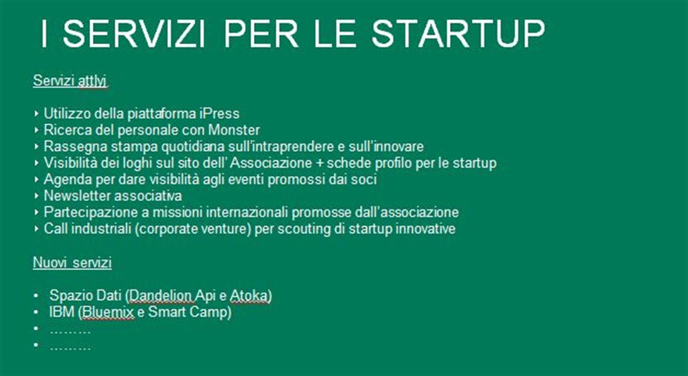 Sono infatti numerosi i servizi che Italia Startup mette a disposizione dei propri associati. Oltre all’accesso gratuito a iPressLIVE, piattaforma che connette i comunicatori con migliaia di giornalisti di altrettante testate italiane e che consente a tutti gli associati l’inserimento di comunicati stampa e la contestuale presenza nella pagina newsroom del sito di Italia Startup, lAassociazione propone un servizio di rassegna stampa quotidiano sul mondo dell’innovazione per essere sempre aggiornati sullo scenario startup. Italia Startup offre inoltre ai suoi associati l’accesso gratuito a Osservatori.net del Politecnico di Milano, la visibilità del logo sul sito associativo, nella categoria di appartenenza, la newsletter e le comunicazioni associative e la presenza nell’area agenda e nell’area deals del sito. Gli associati possono infatti scambiarsi e offrire servizi agli altri associati, ad esempio chi è alla ricerca di nuove risorse umane può accedere al servizio "freemium" messo a disposizione da Monster, che è uno dei soci di Italia Startup. Italia Startup propone inoltre occasioni di networking, scambio e formazione attraverso la partecipazione ad eventi e workshop organizzati dall’Associazione.