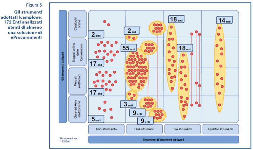 Dei circa 11.000 Enti che costituiscono la nostra PA, possiamo dire che circa il 50% ha utilizzato almeno una volta uno strumento di eProcurement. In realtà quasi 2 su 3 di questi Enti si è limitato a fare qualche acquisto sperimentale sui Mercati Elettronici, senza un reale commitment e, soprattutto, un reale piano di utilizzo serio di questi strumenti. Guardando solo agli Enti che dimostrano un qualche utilizzo regolare dell’eProcurement (circa 2.000), la maggior parte si limita ad utilizzare essenzialmente i Mercati Elettronici e/o i Negozi online a supporto delle Convenzioni. Sono, infatti, ancora solo poche centinaia gli Enti che utilizzano in modo sapiente tutti gli strumenti dell’eProcurement, affiancando ai Mercati Elettronici e ai Negozi elettronici, anche il ricorso a Cataloghi online e alle Gare/Aste elettroniche. In particolare, proprio attraverso le Gare e le Aste online sono negoziati i volumi di acquistato più rilevanti e sono gestite le procedure più “complesse”, per alcuni acquisti soprasoglia o di lavori pubblici.