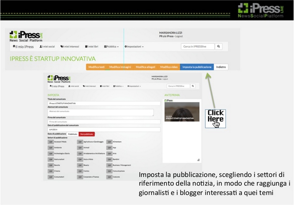 Ogni azienda potrà creare il proprio account su iPressLIVE e iniziare ad utilizzare gratuitamente i servizi della piattaforma da questo momento. Sarà possibile creare la propria pagina aziendale in piattaforma, caricare comunicati e allegati (immagini, presentazioni, fogli di testo, video), integrare l’area press con il proprio sito web per una visualizzazione automatica dei propri comunicati sul proprio sito o qualsiasi altro. Ogni notizia potrà inoltre essere condivisa con un semplice clic sui principali social network.
