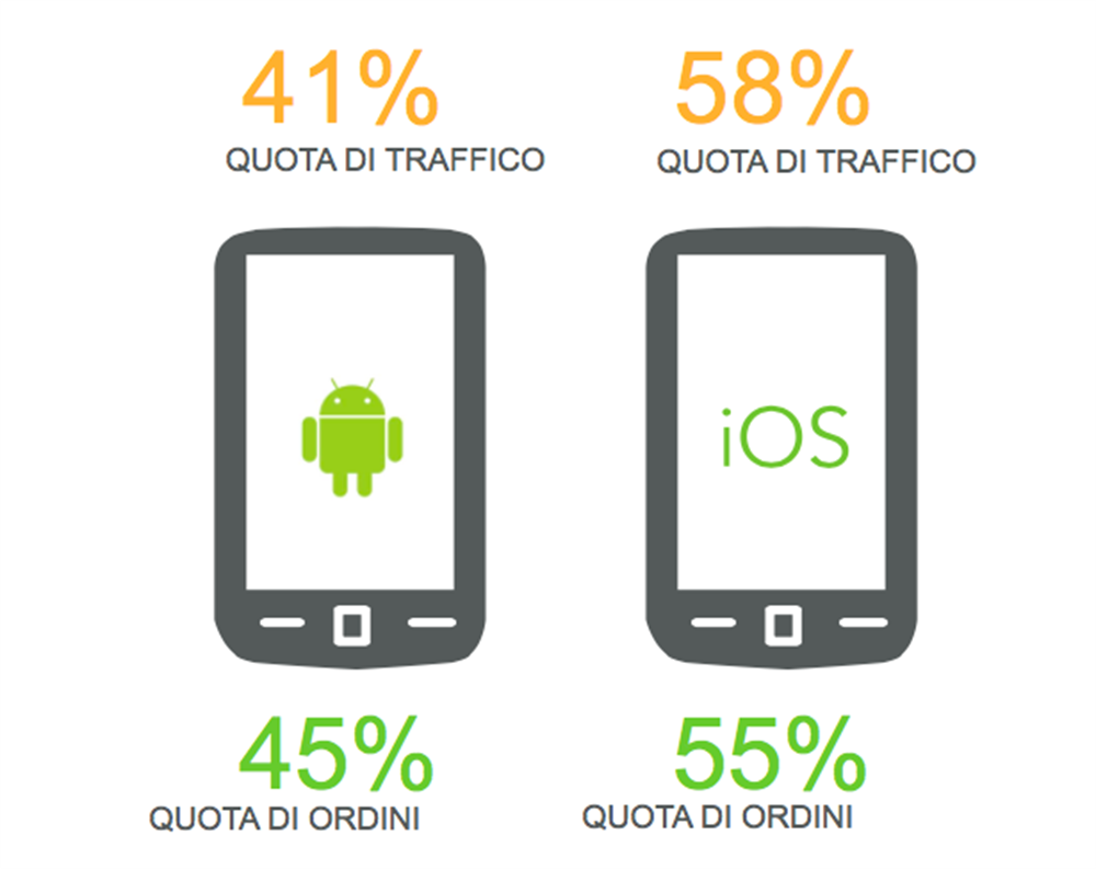 Le percentuali delle quote di traffico sono per l’health and beauty 37% Android e 63% iOS, brand del lusso 25% Android e 75% iOS, abbigliamento 38% Android e 62% iOS, abbigliamento sportivo 43% Android e 47% iOS.